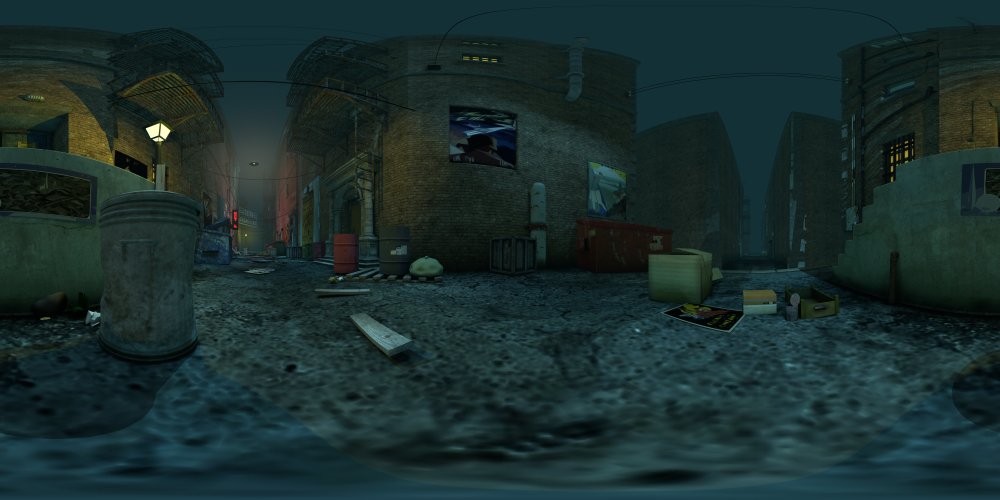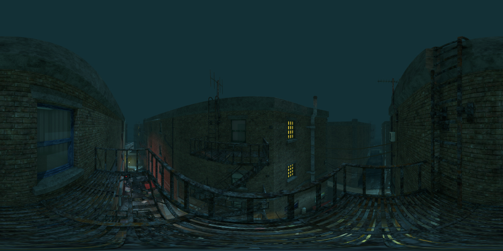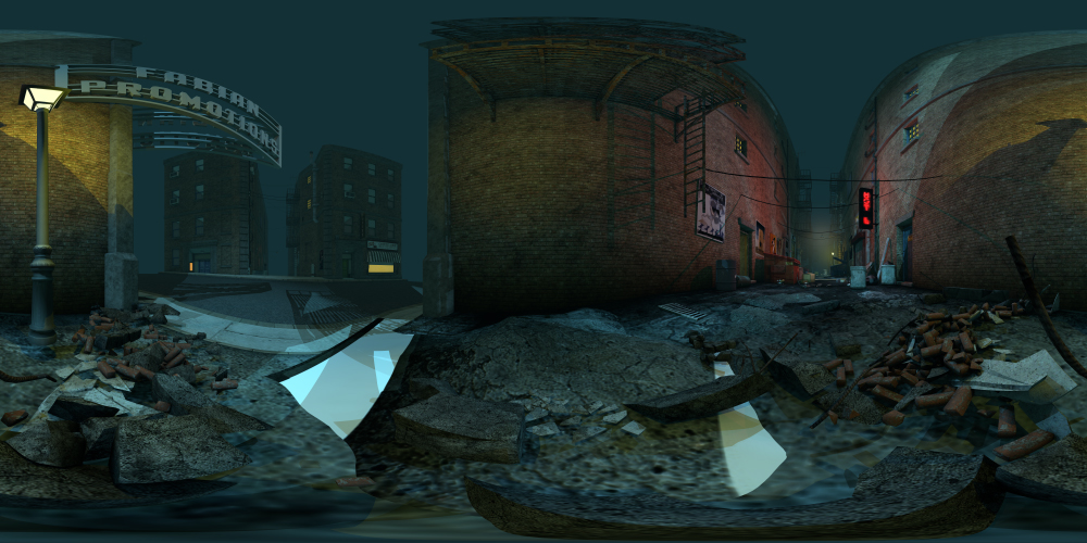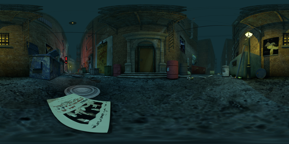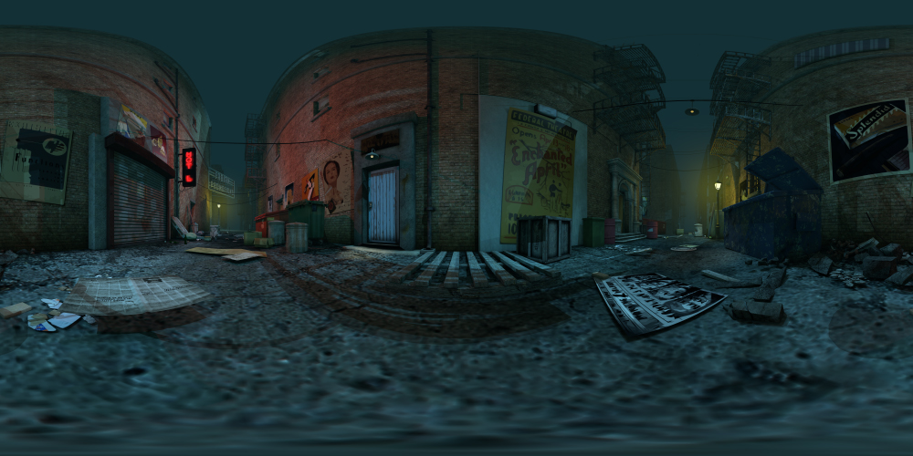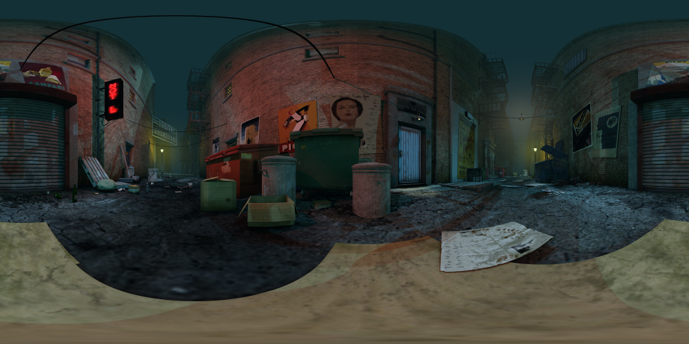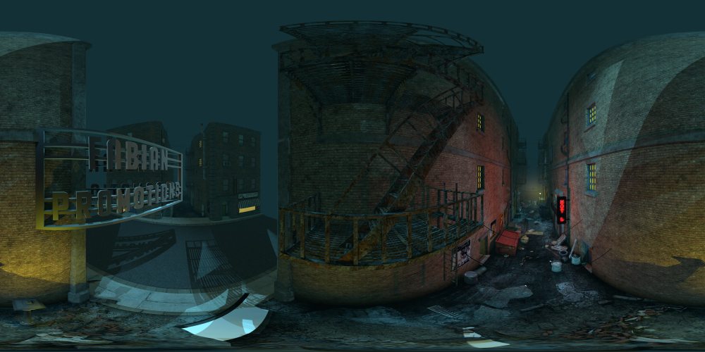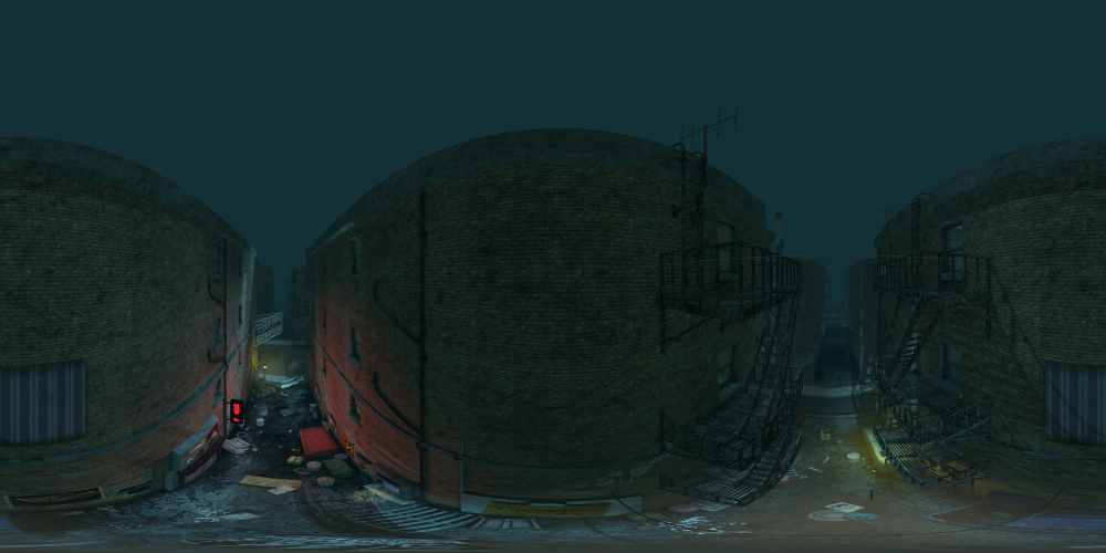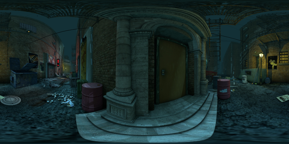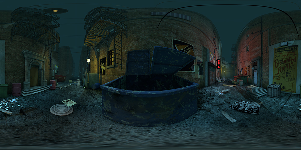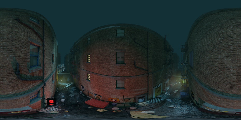 Set in an urban city, this 360° night-time alley background includes street lights, dumpsters, fire escapes, and more. Great for noir projects.